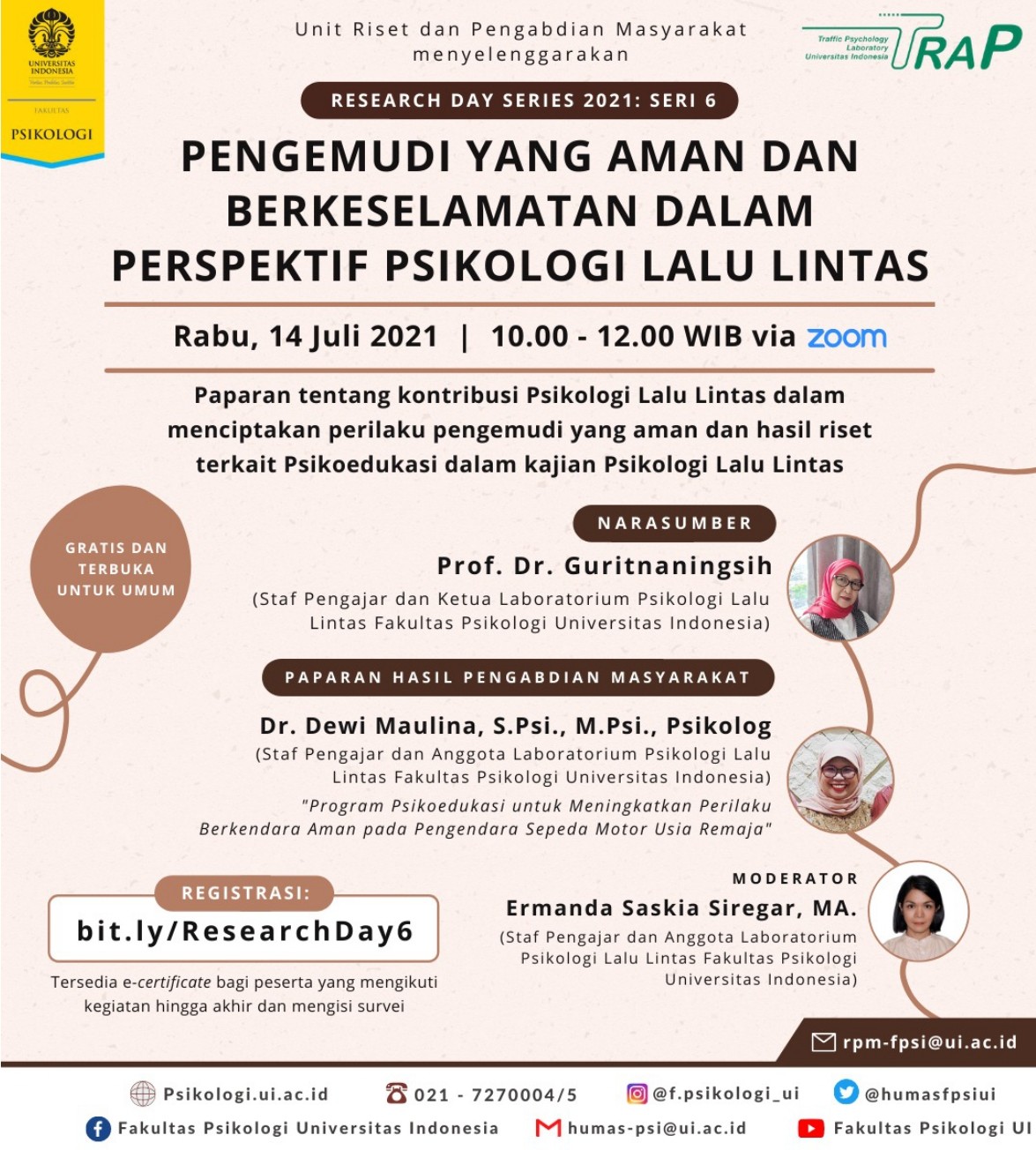 Research Day Series 2021: Seri 6 yang diadakan pada Rabu, 14 Juli 2021 mengangkat topik “Pengemudi yang Aman dan Berkeselamatan dalam Perspektif Psikologi Lalu Lintas” dengan pembicara Prof. Dr. Guritnaningsih dengan moderator Ermanda Saskia Siregar, MA. Research Sharing yang dibahas pada sesi ini adalah Program psikoedukasi untuk meningkatkan perilaku berkendara aman pada pengendara sepeda motor...
