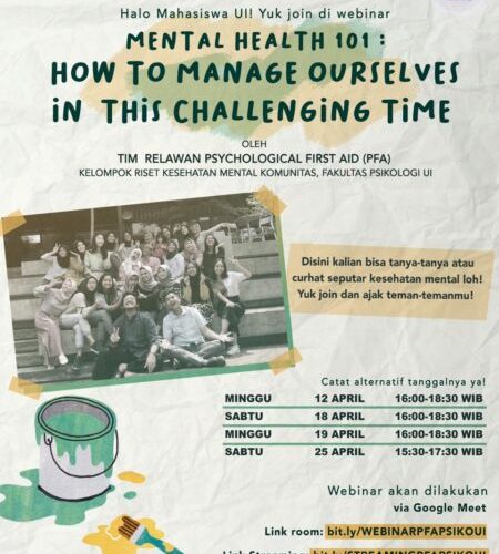 Halo mahasiswa UI! Yuk join di webinar: Mental Health 101: How to manage ourselves in this challenging time Oleh: tim relawan psychological aid (PFA) Kelompok riset kesehatan mental komunitas, fakultas psikologi UIRead More