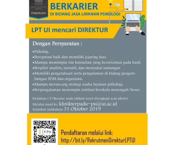 LPT UI mencari direktur. Kirimkan CV/resume melalui email ke: klinikterpadu-psi@ui.ac.id Selambat-lambatnya 31 Oktober 2019 Pendaftaran melalui link: http://bit.ly/RekrutmenDirekturLPTUIRead More