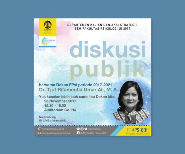 Jum’at (24/11/2017) Departemen Kajian dan Aksi Strategis BEM Fakultas Psikologi UI 2017, mengadakan acara Diskusi Publik Bersama Dekan F.Psi UI Periode 2017 – 2021 Dr. Tjut Rifameutia Umar Ali, M.A., Psikolog. Bertempat di Ruang Auditorium Gedung H F.Psi UI Depok, acara dibuka oleh MC yang dilanjutkan dengan “sharing harapan dengan adanya diskusi bersama Dekan”. Tujuan dilaksanakan sharing harapan dengan diskusi bersama Dekan adalah mendekatkan hubungan antar Civitas dan aspirasi dapat...Read More